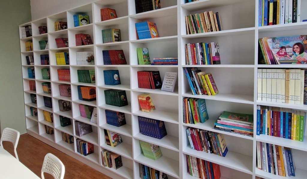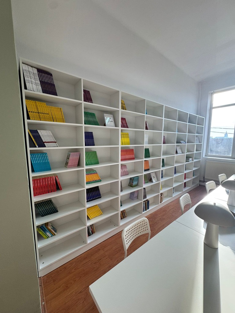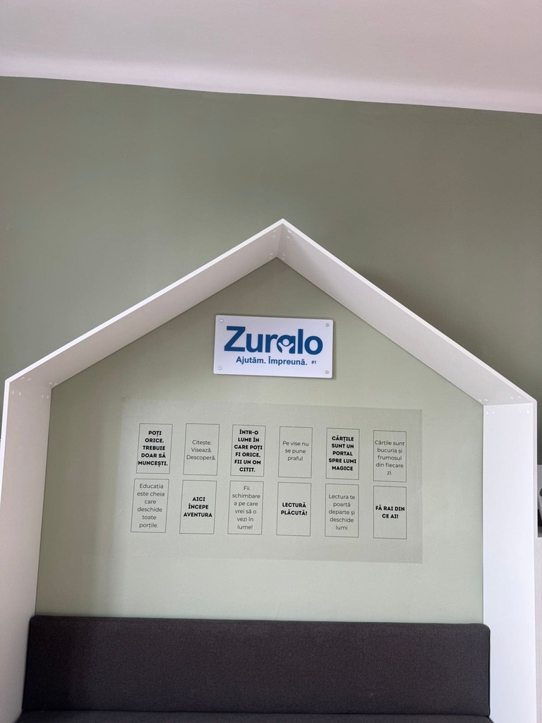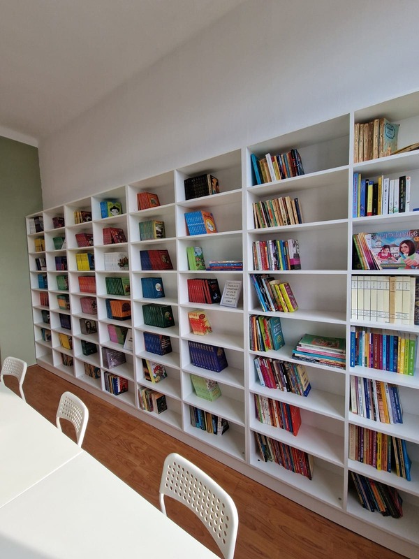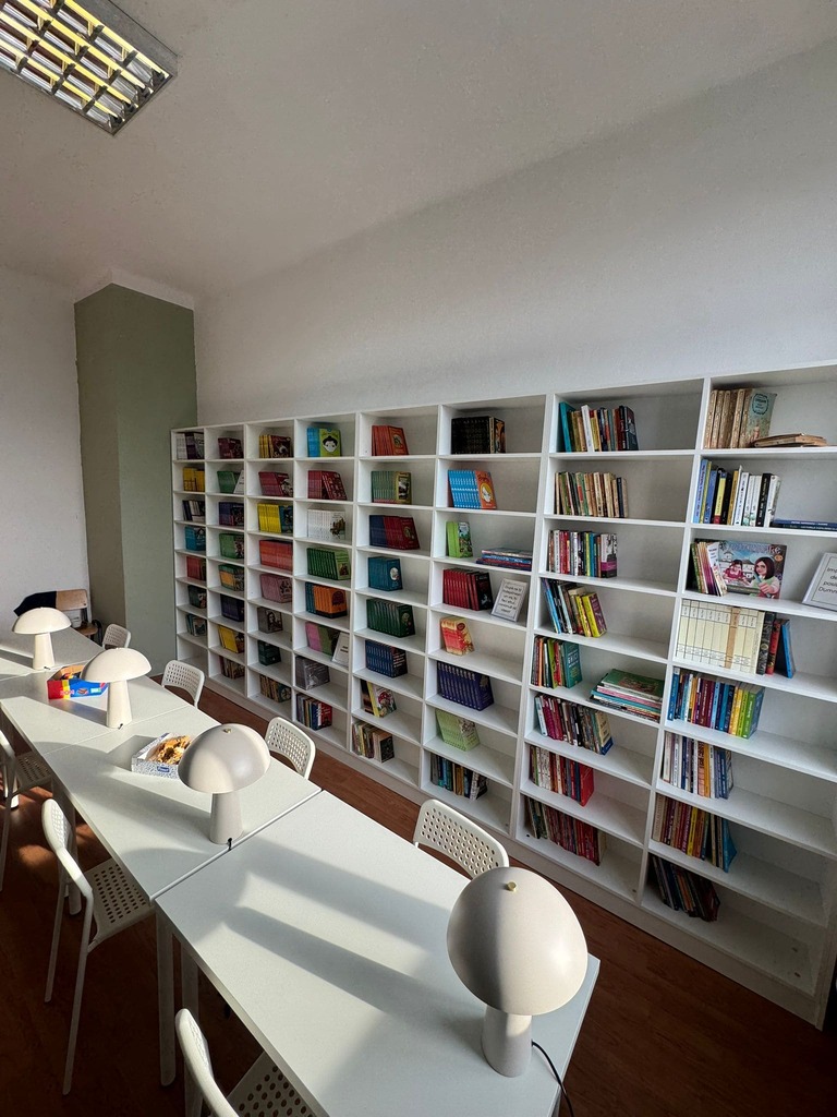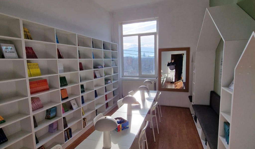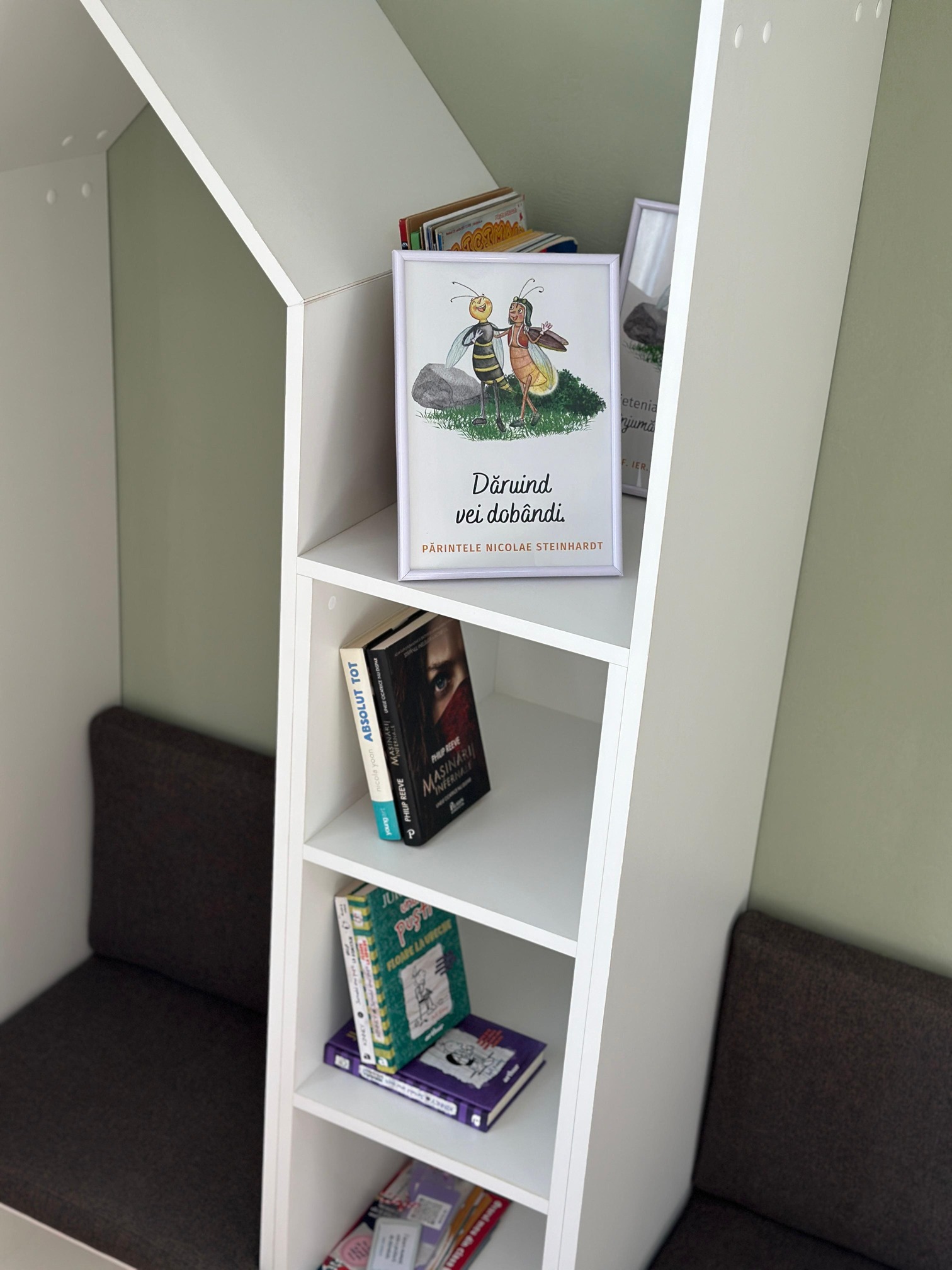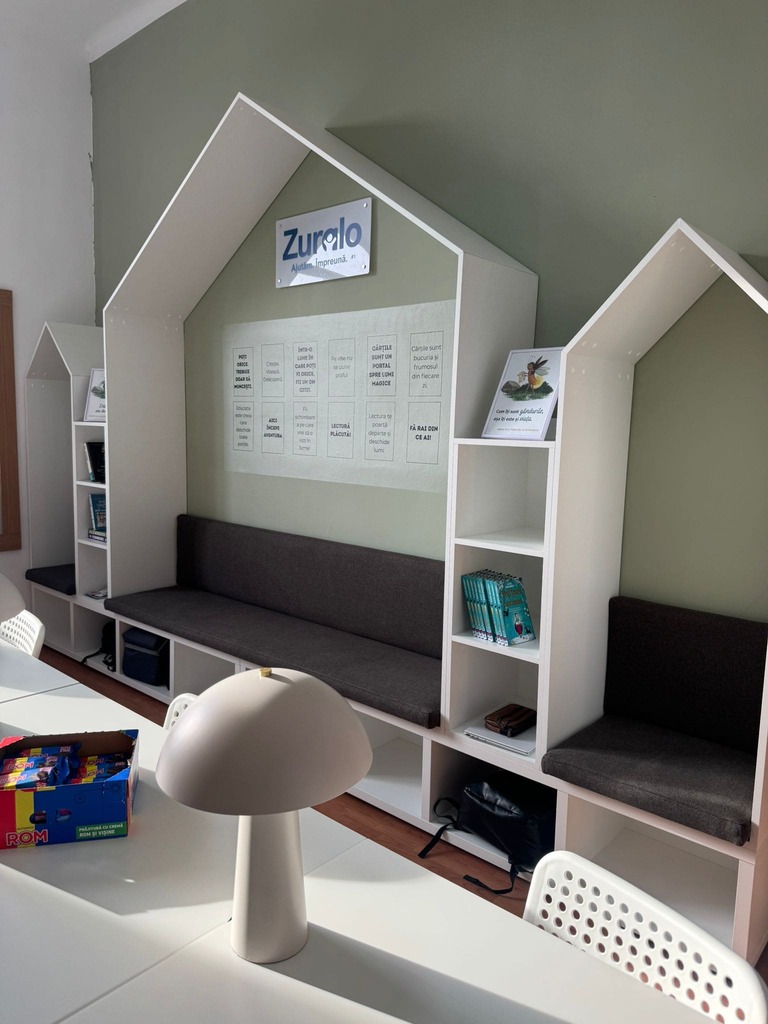 Am colaborat cu un designer de interior pentru realizarea randărilor și optimizarea spațiului, iar mobilierul a fost executat pe comandă. Pentru dotarea bibliotecii, am achiziționat 570 de cărți noi și am completat fondul cu alte 490 de volume provenite din donații. În total, elevii au acum acces la peste 1000 de cărți – literatură pentru copii, lecturi școlare și materiale educaționale.
